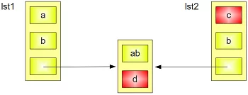The following diagram depicts what happens, if one of the elements of a sublist will be changed: Both the content of lst1 and lst2 are changed.